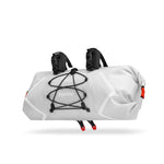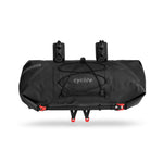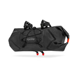 Grundpreis proHANDLE BAR ROLL BAG / 02 ist die ultraleichte Option, viel Ausrüstung am Lenker zu befestigen. Einzeln oder in Kombination mit der HANDLE BAR AERO BAG erweitert sie den Stauraum deutlich und bietet ein gutes Gegengewicht zur SADDLE BAG. Der beidseitige Rollverschluss erleichtert das Packen, und mit den mitgelieferten Kompressionsgurten lassen sich die Enden auch optional so gegeneinander verspannen, dass die Bremsgriffe bei Drop-Bars nicht behindert werden. Das integrierte Kompressionsventil unterstützt dabei kompaktes Packen. Auf der Vorderseite können unter elastischen Straps weitere Ausrüstungsgegenstände fixiert werden. Optional kann der beiliegende Abstandsschaum an der Tasche befestigt werden, der die Kabelführung bei außenliegenden Schalt-und Bremszügen verbessert. Die HANDLE BAR ROLL BAG / 02 eignet sich vor allem dazu, Dinge, auf die man während der Fahrt nicht unbedingt zugreifen muss, wie Zelt, Isomatte oder warme Bekleidung, unterzubringen. HANDLE BAR ROLL BAG / 02 ist dank des eigens von Cyclite entwickelten LiteGrid-RN200T3-Materials ultraleicht, robust und wetterfest. Dafür wurden zwei unterschiedlich starke Nylonarten mittels einer speziellen Webtechnik zu einem Ripstop-Gewebe verarbeitet, das anschließend beidseitig beschichtet und hochfrequenzverschweißt wird. So entsteht die perfekte Symbiose aus Leichtigkeit und Stabilität – für wetterfeste Produkte, die sich leicht reinigen lassen.