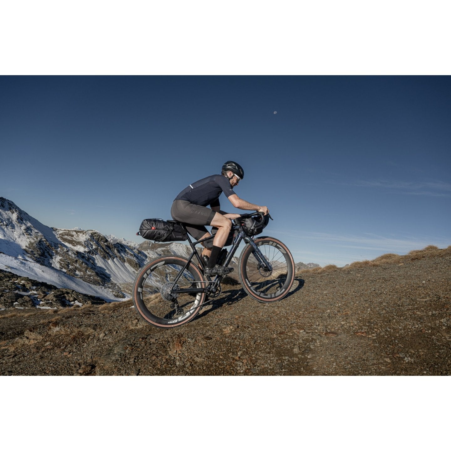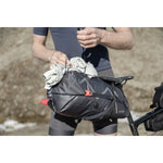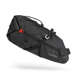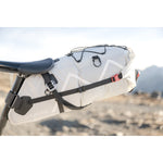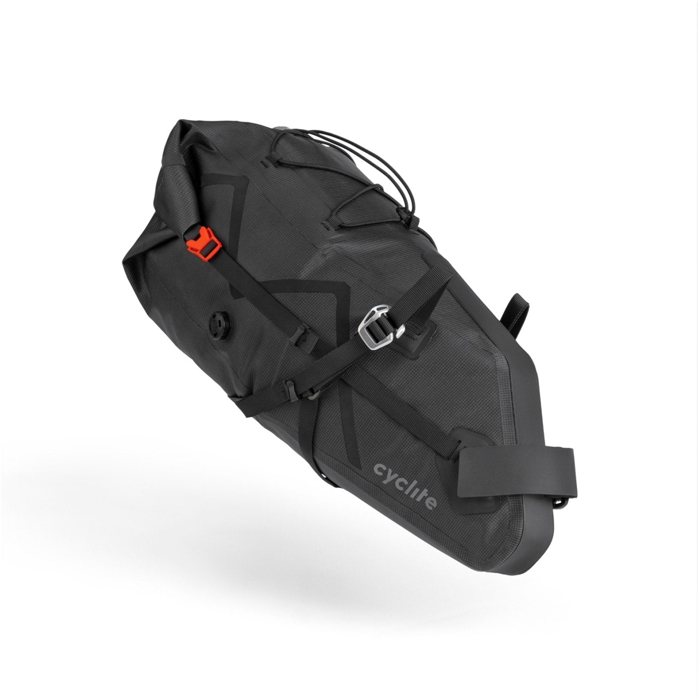 Grundpreis proSADDLE BAG / 02 ist der Klassiker unter den Bikepacking-Taschen. Hier lässt sich im Windschatten des Fahrers richtig viel Gepäck unterbringen. Typischerweise neigen solche Taschen aber dazu, besonders im Wiegetritt hin und her zu schwingen. Daher hat Cyclite der stabilen Anbringung besonderes Augenmerk gewidmet. Mittels Aluminiumhaken und einem untersetzten Gurtsystem wird die Tasche gegen jede Sattelschiene einzeln verspannt. Auch dank der mittigen Carbon-Leiste entsteht so ein sehr stabiler, ultra-leichter Gepäckraum. Zum steiferen Packen mit dem Rollverschluss besitzt die Tasche ein Ventil als Luftauslass. Auf der Oberseite können unter elastischen Straps weitere Ausrüstungsgegenstände fixiert werden. Anbringungsmöglichkeiten für das Rücklicht sind ebenfalls vorhanden. Die SADDLE BAG / 02 eignet sich vor allem dazu, Dinge, auf die man während der Fahrt nicht unbedingt zugreifen muss, wie Schlafsack, Toilettenartikel und Wechselbekleidung, unterzubringen. SADDLE BAG / 02 ist dank des eigens von Cyclite entwickelten LiteGrid-RN200T3-Materials ultraleicht, robust und wetterfest. Dafür werden zwei unterschiedlich starke Nylonarten mittels einer speziellen Webtechnik zu einem Ripstop-Gewebe verarbeitet, das anschließend beidseitig beschichtet und hochfrequenzverschweißt wird. So entsteht die perfekte Symbiose aus Leichtigkeit und Stabilität – für wetterfeste Produkte, die sich leicht reinigen lassen.