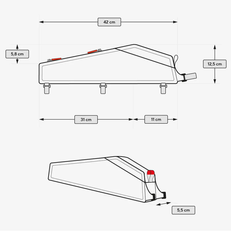 Die TOP TUBE BAG LARGE benötigt einen Mindestabstand Steuerkopf-Sattelstütze von 44cm. Sie ist mit allen CYCLITE FRAME BAGs und den meisten Rahmentaschen anderer Hersteller kompatibel, da die Position der Fixierungsgurte verschoben werden kann. Die Tasche ist bolt-on ready.