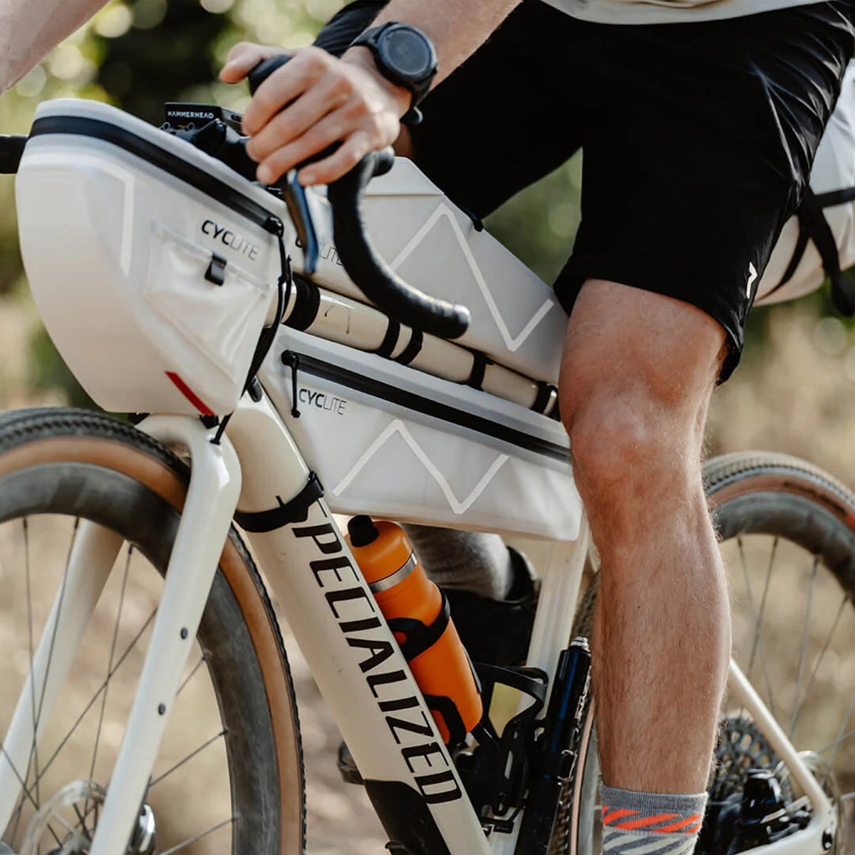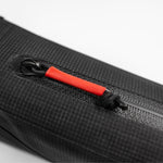 TOP TUBE BAG LARGE / 02 ist die größere Schwester von TOP TUBE BAG / 03 und mit 2,2 Litern Volumen auf dem Oberrohr die Lösung für alle diejenigen, die längere Zeit unterwegs sind, in ihrem Rahmen keinen Platz für eine FRAME BAG haben oder sich den „Luxus“ von mehr Stauraum mit direktem Zugriff während der Fahrt wünschen. Auch die TOP TUBE BAG LARGE / 02 kommt mit einem sehr großen Zugriff auf das vordere Fach, das mit Überwurfdeckel und Magnetschnalle verschlossen wird. Das hintere Fach lässt sich mit einem mittigen, wetterfesten Reißverschluss öffnen und dient damit zum Verstauen von Dingen, auf die man seltener während der Fahrt zugreift. Die nach hinten zulaufende Form verhindert Kontakt mit den Oberschenkeln. Von der kleineren Version bekannte Funktionen wie der Kabelausgang finden sich auch in der TOP TUBE BAG LARGE / 02 wieder. Trotz ihres großen Volumens ist sie eine ultraleichte Tasche, die bereits viele Fans, besonders bei Ultra-Distanz-Fahrern, gefunden hat. Gegenüber der Vorgängerversion wurde die Frontgurtkonstruktion weiterentwickelt: Der Klettgurt ist nun austausch-und verlängerbar – somit auch mit integrierten Lenkern kompatibel. Zudem ist die Tasche nun bolt-on ready und kann aufs Oberrohr geschraubt werden.